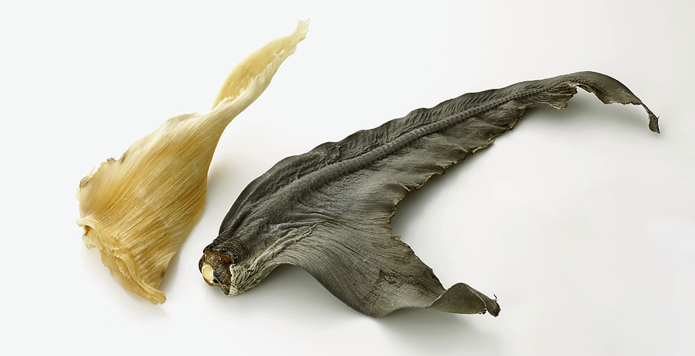(鮫のヒレを乾燥させたものと、そこから皮を剥いたもの)