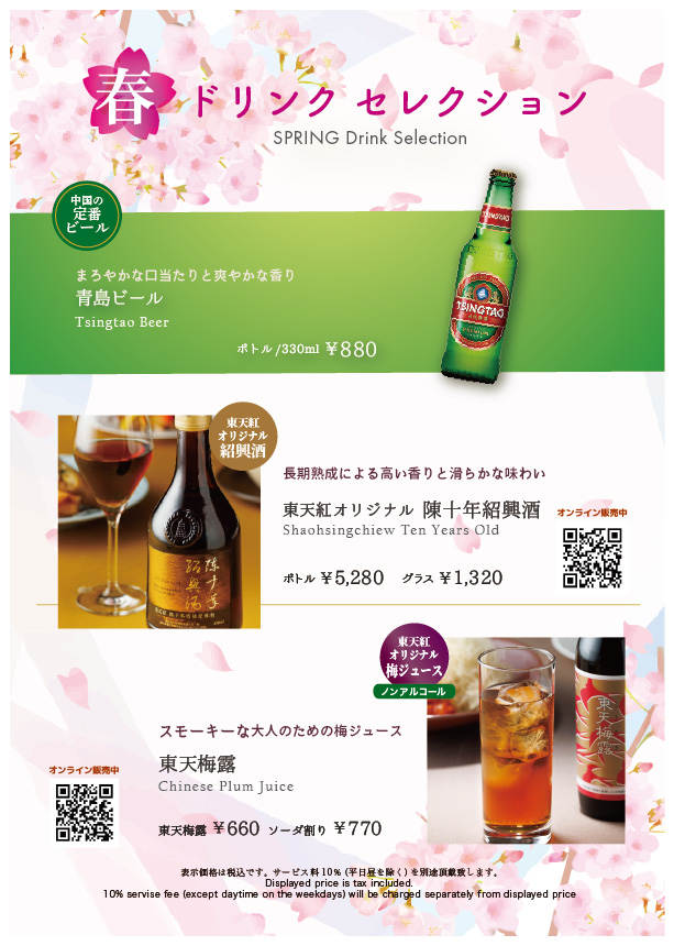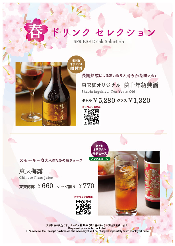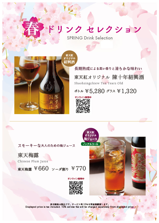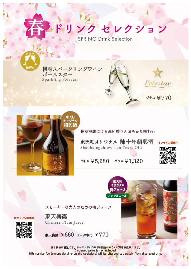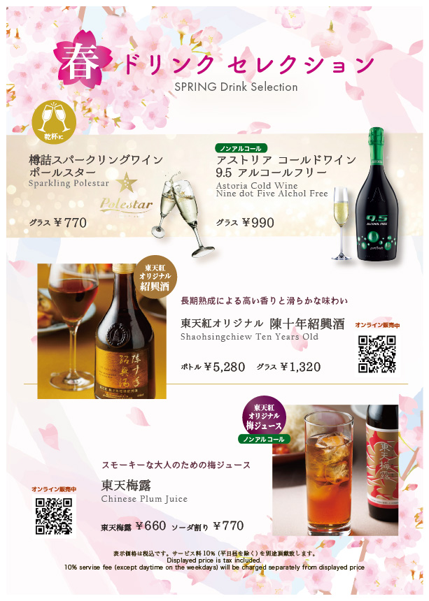暖かな日差しに春の訪れを感じる季節となりました。 東天紅では、この季節のお集まりをより華やかに彩る「SPRING Drink Selection」をご用意いたしました。